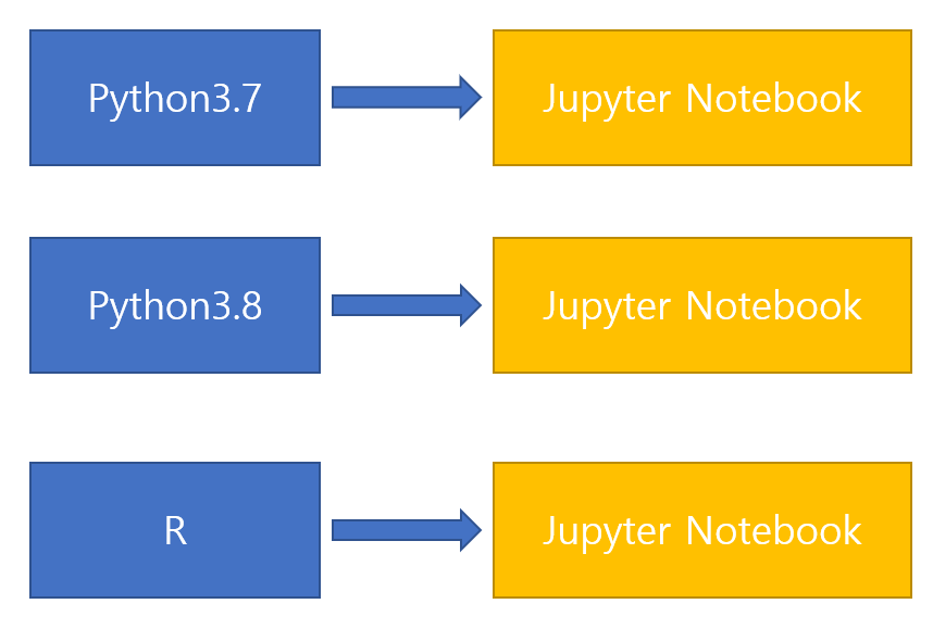 Jupyter notebook의 경우에도 pip를 사용하여 깔 수 있으나 조금은 다른 방식으로 접근을 해주어야한다는 것을 알 수가 있습니다. 바로 R과 같은 다른 언어에서도 기존의 Jupyter Notebook을 이용하여 사용할 수 있다는 점인데요. 아까의 패키지가 각각의 버전에 따로 깔려서 사용한다면 R에서는 작동이 되지 않아야하는데, R과 같은 다른 언어에서도 사용할 수 있다는 점이 살짝 이상하게 다가오긴 합니다. 때문에 관계는 다음과 같게 설정됨을 알 수가 있습니다.