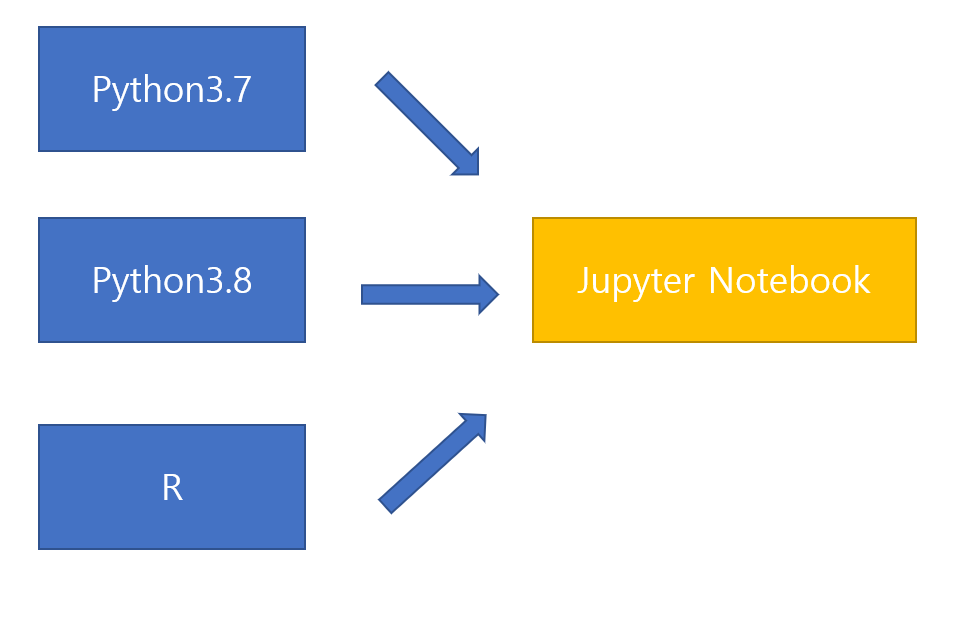 Jupyter notebook의 경우에도 pip를 사용하여 깔 수 있으나 조금은 다른 방식으로 접근을 해주어야한다는 것을 알 수가 있습니다. 바로 R과 같은 다른 언어에서도 기존의 Jupyter Notebook을 이용하여 사용할 수 있다는 점인데요. 아까의 패키지가 각각의 버전에 따로 깔려서 사용한다면 R에서는 작동이 되지 않아야하는데, R과 같은 다른 언어에서도 사용할 수 있다는 점이 살짝 이상하게 다가오긴 합니다. 때문에 관계는 다음과 같게 설정됨을 알 수가 있습니다.